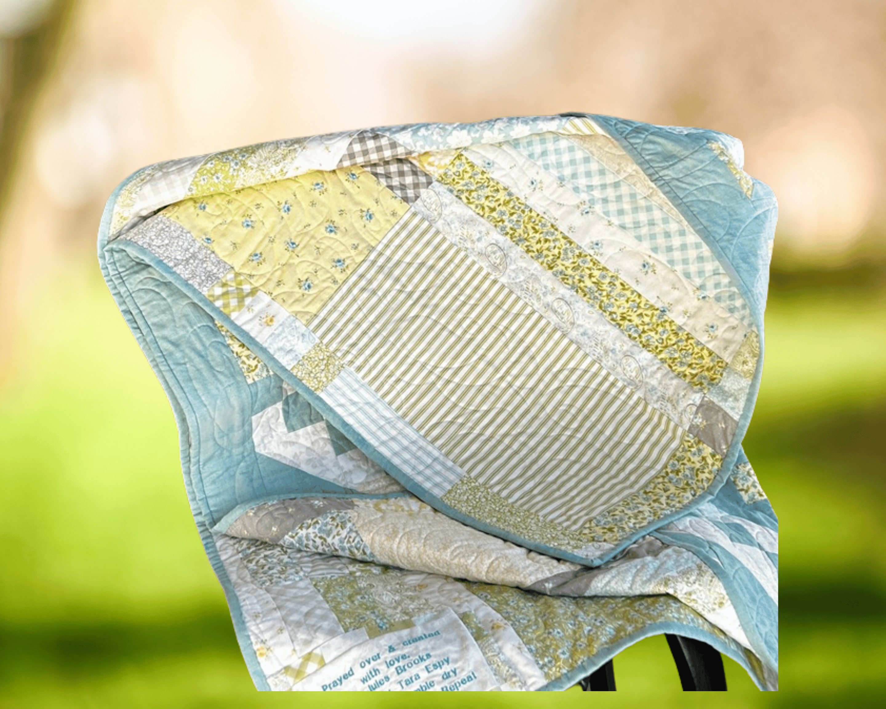 Wrap yourself in warmth and color with this stunning Jacob’s Ladder throw quilt — a timeless patchwork pattern brought to life in shades of teal, yellow, and crisp white. Each block is carefully pieced and quilted to create a bright, cheerful design that adds charm and comfort to any room.